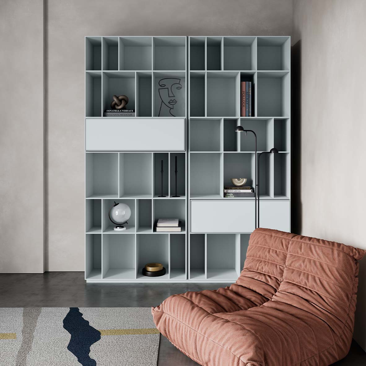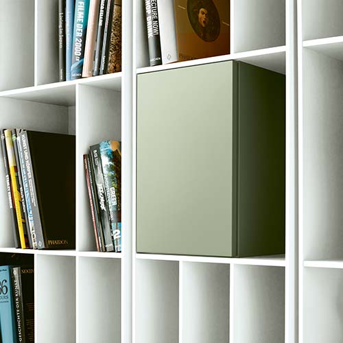 Flex bietet fertige Korpusregale mit fester Einteilung, die frei kombiniert und variiert werden können. Durch das Zusammenspiel unterschiedlicher Regalelemente entsteht ein spannungsvolles Grundraster, das sich kreativ bespielen lässt. Boxen ergänzen das System und können je nach Wunsch ruhig oder lebhaft eingesetzt werden – frontbündig für ein harmonisches Gesamtbild oder in zwei Tiefen hervortretend für eine rhythmische, vielschichtige Optik. Auch hängend montiert entfaltet Flex seine besondere Wirkung.