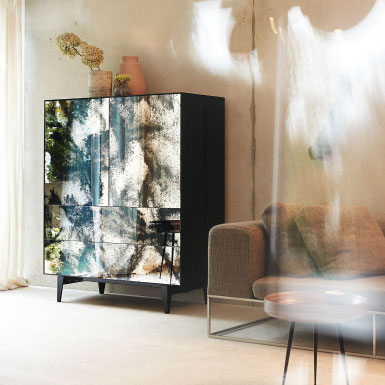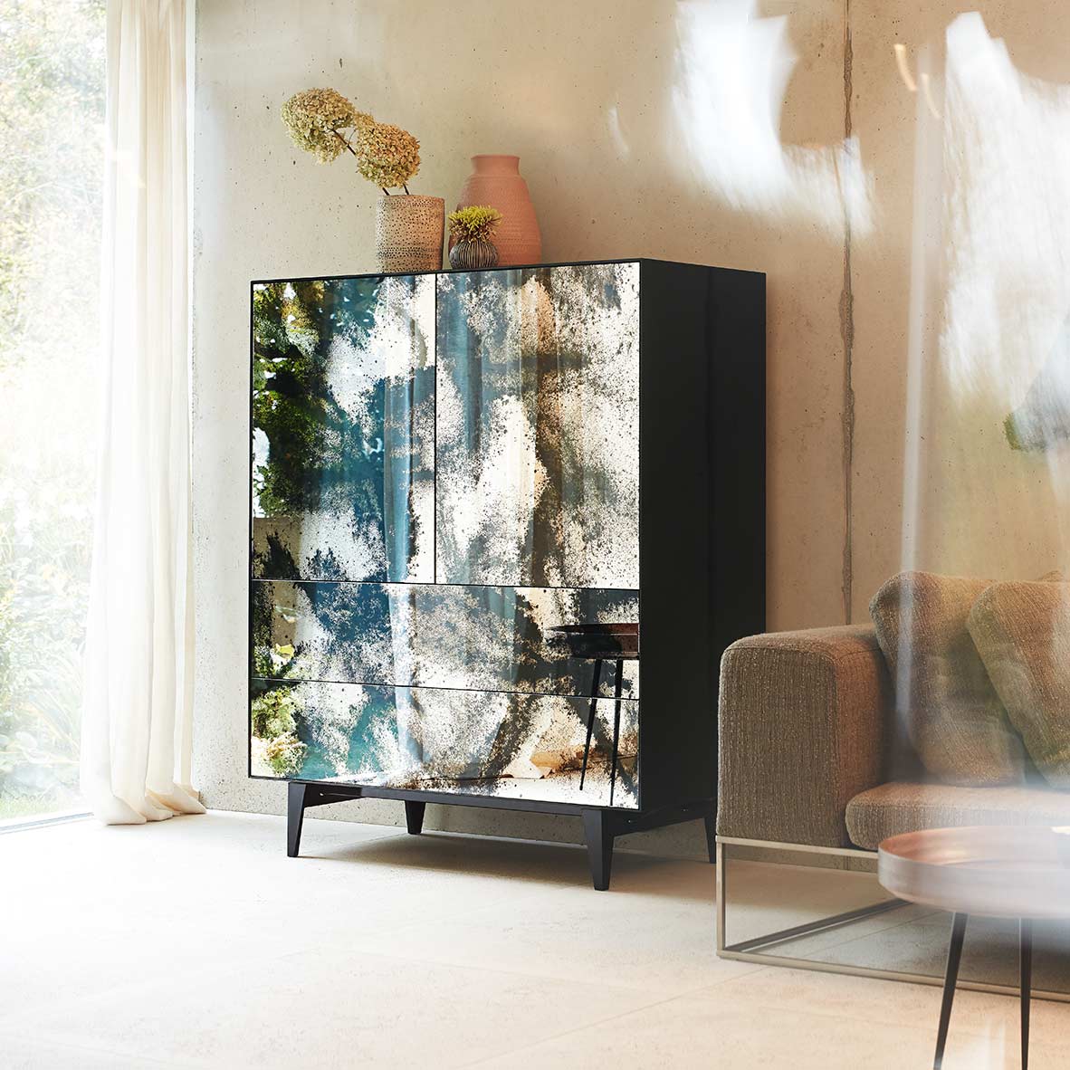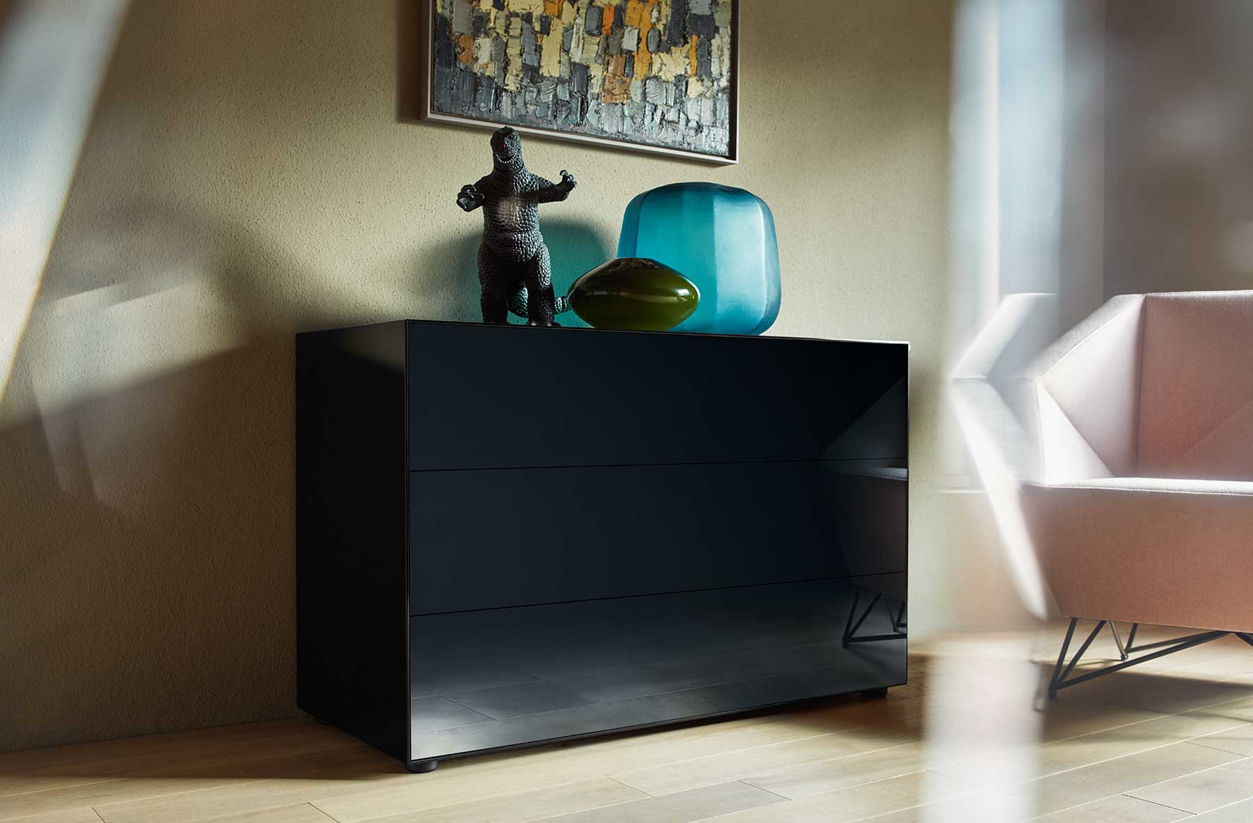 So entstehen Möbel von besonderer Ausstrahlung, die trotz puristischer Form gezielte Glanzlichter setzen und in ihrer Wirkung einzigartig bleiben. Keine Oberfläche gleicht der anderen: Jede Glasfront wird aufwendig von Hand gestaltet und gefertigt und verleiht dem Möbel seinen unverwechselbaren, luxuriösen Charakter. Glamour ist in verschiedenen festgelegten Varianten erhältlich – in höheren und niedrigeren Ausführungen sowie in vier ausdrucksstarken Farbstellungen.