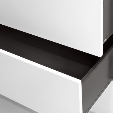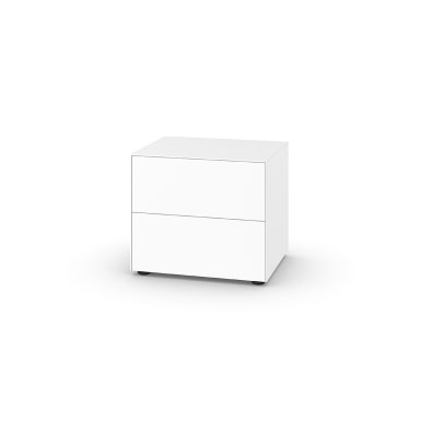 Finessenreich im Detail, präzise auf Gehrung gearbeitet und mit feinen Schattenfugen versehen, vereinen die Nex Pur Boxen hohe Variabilität mit zeitloser Gestaltung. Sie sind eine Auswahl der beliebtesten Einzelkommoden mit Türen, Schubladen oder Klappen.